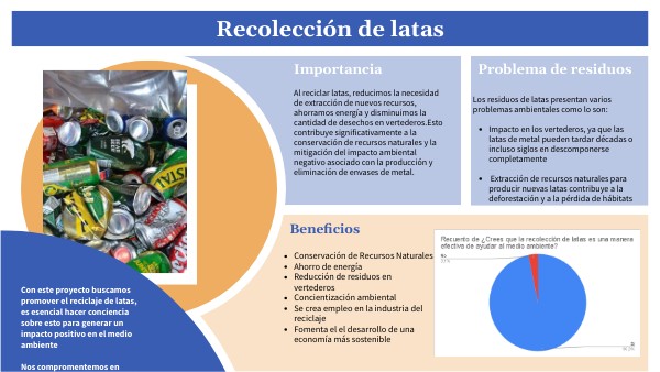 Con este proyecto buscamos promover el reciclaje de latas, es esencial hacer conciencia sobre esto para generar un impacto positivo en el medio ambiente Nos compromentemos en reducir la huella ambiental y fomentar el construir un futuro más limpio y sostenible La recolección de latas es una iniciativa clave para la gestión sostenible de residuos