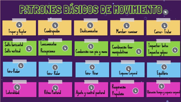 Los patrones básicos de movimiento (PBM) son destrezas motrices fundamentales para el desarrollo de destrezas complejas; necesarias para participar en una gran variedad de actividades a lo largo de la vida, como juegos y deportes.Los patrones básicos de movimiento —también llamadas destrezas simples—comúnmente se clasifican en actividades locomotoras y en actividades manipulativas. Los patrones locomotores sirven para desplazar el cuerpo de un lugar al otro comonpor ejemplo caminar, correr, saltar, brincar, galopar; mientras que los manipulativos se utilizan para proyectar o recibir objetos por ejemplo lanzar, apañar, patear, rebotar.