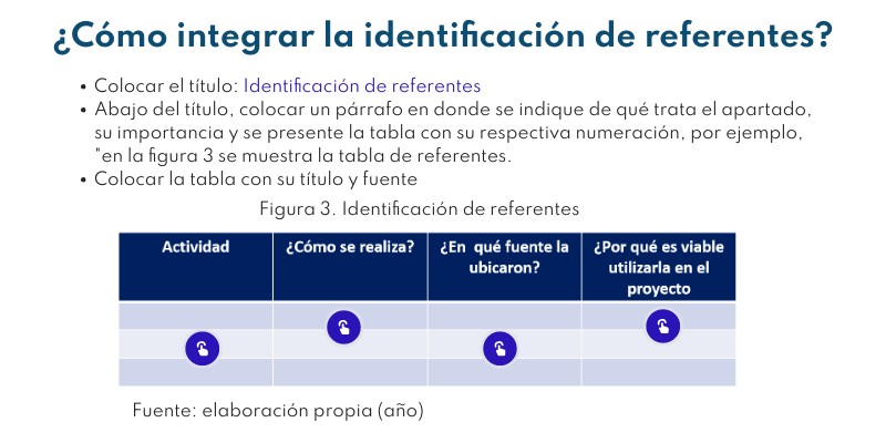 - Abajo del título, colocar un párrafo en donde se indique de qué trata el apartado, su importancia y se presente la tabla con su respectiva numeración, por ejemplo, "en la figura 3 se muestra la tabla de referentes.