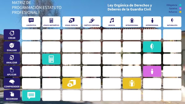 1- Inteligencia y categoría de Bloom. Se van a trabajar diferentes campos de la inteligencia múltiple, así como diferentes categorías de Bloom. 2- Objetivos de aprendizaje. Interiorizar los derechos y deberes que asisten a los guardias civiles, analizar la importancia de la temática y conocer el régimen asociativo del cuerpo. 3- Reto: ¿qué hay que resolver?. Un test de autoevaluación final a través de quizziz. 4- Resultado o producto final a obtener. Se han identificado correctamente los principios, derechos y deberes de la norma, asimilando jurídicamente su ejercicio y protección. 5- Materiales y documentación. La norma extraída del BOE.