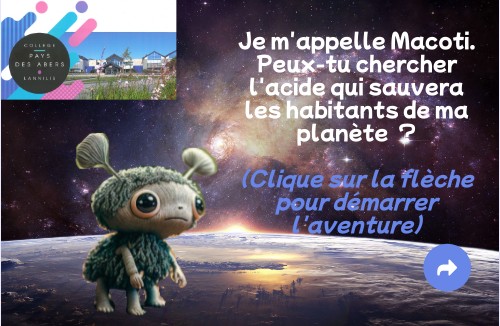 Je m'appelle Macoti. Peux-tu chercher l'acide qui sauvera les habitants de ma planète ? (Clique sur la flèche pour démarrer l'aventure)
