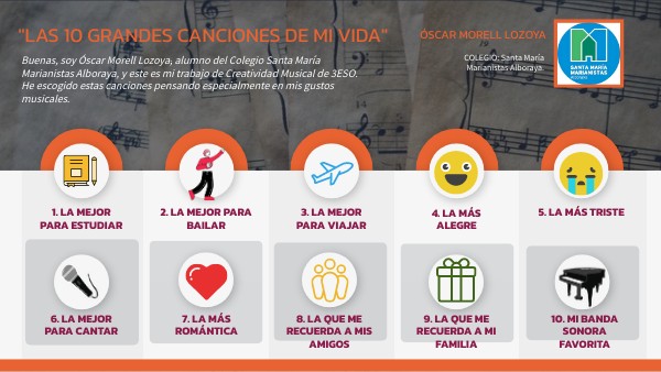 Buenas, soy Óscar Morell Lozoya, alumno del Colegio Santa María Marianistas Alboraya, y este es mi trabajo de Creatividad Musical de 3ESO. He escogido estas canciones pensando especialmente en mis gustos musicales.