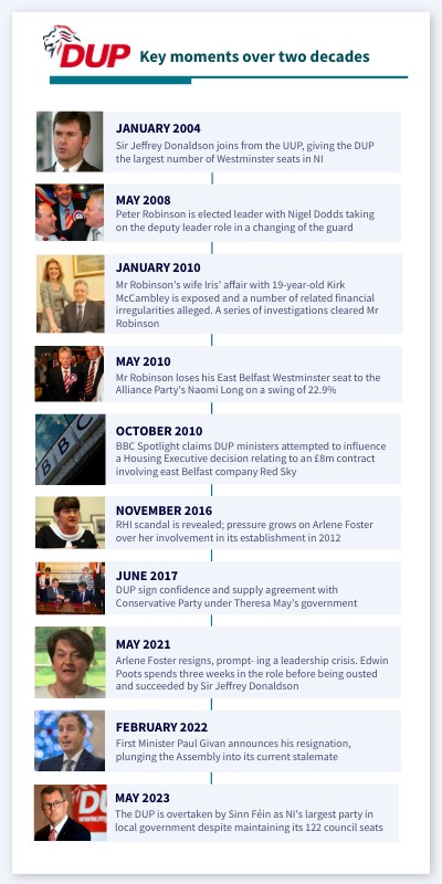 Arlene Foster resigns, prompt- ing a leadership crisis. Edwin Poots spends three weeks in the role before being ousted and succeeded by Sir Jeffrey Donaldson