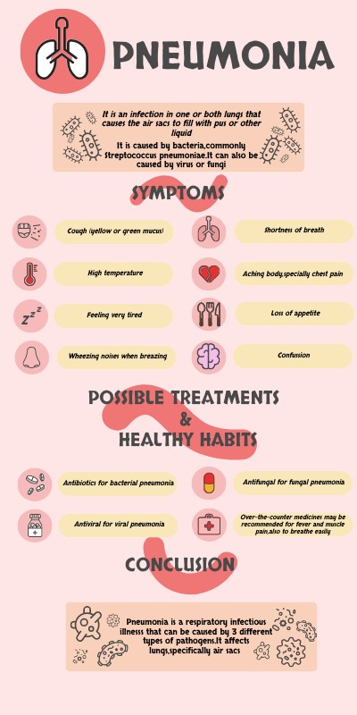 Pneumonia is a respiratory infectious illnesss that can be caused by 3 different types of pathogens.It affects lungs,specifically air sacs
