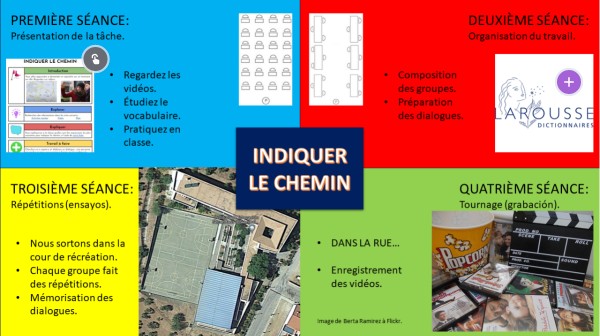 Se trata de realizar un vídeo en parejas o grupos de tres, en donde se escenifica a un turista perdido y se le indica por dónde ir al lugar deseado.