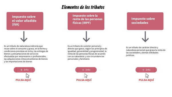 - Hecho imponible: Obtención de la renta del contribuyente; Tipos-> Rendimientos del trabajo, rendimientos del capital, rendimientos de las actividades económicas, ganancias y pérdidas patrimoniales e imputaciones de renta que se establezcan por ley