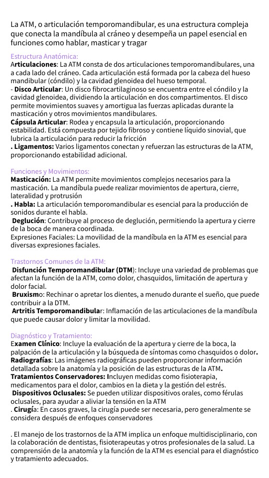 Estructura Anatómica: Articulaciones: La ATM consta de dos articulaciones temporomandibulares, una a cada lado del cráneo. Cada articulación está formada por la cabeza del hueso mandibular (cóndilo) y la cavidad glenoidea del hueso temporal. - Disco Articular: Un disco fibrocartilaginoso se encuentra entre el cóndilo y la cavidad glenoidea, dividiendo la articulación en dos compartimentos. El disco permite movimientos suaves y amortigua las fuerzas aplicadas durante la masticación y otros movimientos mandibulares. Cápsula Articular: Rodea y encapsula la articulación, proporcionando estabilidad. Está compuesta por tejido fibroso y contiene líquido sinovial, que lubrica la articulación para reducir la fricción . Ligamentos: Varios ligamentos conectan y refuerzan las estructuras de la ATM, proporcionando estabilidad adicional. Funciones y Movimientos: Masticación: La ATM permite movimientos complejos necesarios para la masticación. La mandíbula puede realizar movimientos de apertura, cierre, lateralidad y protrusión . Habla: La articulación temporomandibular es esencial para la producción de sonidos durante el habla. Deglución: Contribuye al proceso de deglución, permitiendo la apertura y cierre de la boca de manera coordinada. Expresiones Faciales: La movilidad de la mandíbula en la ATM es esencial para diversas expresiones faciales. Trastornos Comunes de la ATM: Disfunción Temporomandibular (DTM): Incluye una variedad de problemas que afectan la función de la ATM, como dolor, chasquidos, limitación de apertura y dolor facial. Bruxismo: Rechinar o apretar los dientes, a menudo durante el sueño, que puede contribuir a la DTM. Artritis Temporomandibular: Inflamación de las articulaciones de la mandíbula que puede causar dolor y limitar la movilidad. Diagnóstico y Tratamiento: Examen Clínico: Incluye la evaluación de la apertura y cierre de la boca, la palpación de la articulación y la búsqueda de síntomas como chasquidos o dolor. Radiografías: Las imágenes radiográficas pueden proporcionar información detallada sobre la anatomía y la posición de las estructuras de la ATM. Tratamientos Conservadores: Incluyen medidas como fisioterapia, medicamentos para el dolor, cambios en la dieta y la gestión del estrés. Dispositivos Oclusales: Se pueden utilizar dispositivos orales, como férulas oclusales, para ayudar a aliviar la tensión en la ATM . Cirugía: En casos graves, la cirugía puede ser necesaria, pero generalmente se considera después de enfoques conservadores . El manejo de los trastornos de la ATM implica un enfoque multidisciplinario, con la colaboración de dentistas, fisioterapeutas y otros profesionales de la salud. La comprensión de la anatomía y la función de la ATM es esencial para el diagnóstico y tratamiento adecuados.