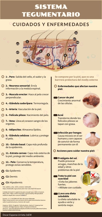 Piel, cabello y uñas. (2019, octubre). kidshealth. https://kidshealth.org/es/teens/skin-hair-nails.html?ref=searchCuidado de la piel: 5 sugerencias para una piel sana. (2022, 22 enero). Mayo Clinic. https://www.mayoclinic.org/es/healthy-lifestyle/adult-health/in-depth/skin-care/art-20048237 Eucerin. (s. f.). EUCERIN-INT-Skin-Structure-00Header. https://www.eucerin.com.mx/acerca-de-la-piel/conocimientos-basicos-sobre-la-piel/estructura-y-funcion-de-la-piel Insparya. (2022, 10 agosto). Folículo piloso, ¿Qué es? | Insparya Hair Company. <i>Insparya. https://insparya.es/foliculo-piloso/#:~:text=El%20bulbo%20piloso%20forma%20la,diferentes%20momentos%20de%20la%20vida.