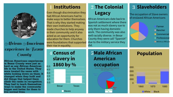 African Americans date back to Spanish settlement where there was not as much slavery sue to only them having domestic work. The community was also well racially diverse. In Bexar County they were call “Spanish” due to the military service they did.