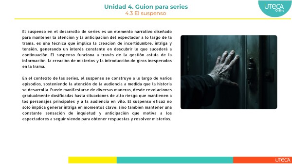 El suspenso en el desarrollo de series es un elemento narrativo diseñado para mantener la atención y la anticipación del espectador a lo largo de la trama, es una técnica que implica la creación de incertidumbre, intriga y tensión, generando un interés constante en descubrir lo que sucederá a continuación. El suspenso funciona a través de la gestión astuta de la información, la creación de misterios y la introducción de giros inesperados en la trama. En el contexto de las series, el suspenso se construye a lo largo de varios episodios, sosteniendo la atención de la audiencia a medida que la historia se desarrolla. Puede manifestarse de diversas maneras, desde revelaciones gradualmente dosificadas hasta situaciones de alto riesgo que mantienen a los personajes principales y a la audiencia en vilo. El suspenso eficaz no solo implica generar intriga en momentos clave, sino también mantener una constante sensación de inquietud y anticipación que motiva a los espectadores a seguir viendo para obtener respuestas y resolver misterios.