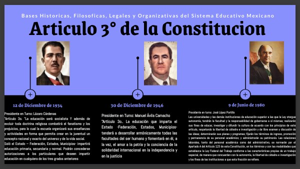 Presidente en Turno: Manuel Ávila Camacho "Artículo 3o.. La educación que imparta el Estado -Federación, Estados, Municipios- tenderá a desarrollar armónicamente todas las facultades del ser humano y fomentará en él, a la vez, el amor a la patria y la conciencia de la solidaridad internacional en la independencia y en la justicia