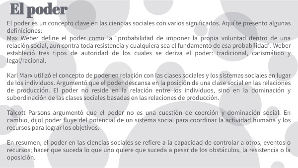 El poder es un concepto clave en las ciencias sociales con varios significados. Aquí te presento algunas definiciones: Max Weber define el poder como la "probabilidad de imponer la propia voluntad dentro de una relación social, aun contra toda resistencia y cualquiera sea el fundamento de esa probabilidad". Weber estableció tres tipos de autoridad de los cuales se deriva el poder: tradicional, carismático y legal/racional. Karl Marx utilizó el concepto de poder en relación con las clases sociales y los sistemas sociales en lugar de los individuos. Argumentó que el poder descansa en la posición de una clase social en las relaciones de producción. El poder no reside en la relación entre los individuos, sino en la dominación y subordinación de las clases sociales basadas en las relaciones de producción. Talcott Parsons argumentó que el poder no es una cuestión de coerción y dominación social. En cambio, dijol poder fluye del potencial de un sistema social para coordinar la actividad humana y los recursos para lograr los objetivos. En resumen, el poder en las ciencias sociales se refiere a la capacidad de controlar a otros, eventos o recursos; hacer que suceda lo que uno quiere que suceda a pesar de los obstáculos, la resistencia o la oposición.