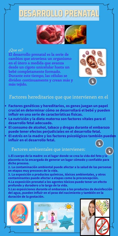 ¿Que es? El desarrollo prenatal es la serie de cambios que atraviesa un organismo en el útero a medida que avanza desde un cigoto unicelular hasta un bebé completamente formado. Durante este tiempo, las células se dividen continuamente y crean más y más tejido.