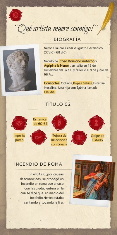 Nerón Claudio César Augusto Germánico (37d.C - 68 d.C) Nacido de Cneo Domicio Enobarbo y Agripina la Menor , en Italia en 15 de Diciembre del 37a.C y falleció el 9 de junio de 68 A.c Consortes: Octavia,Popea Sabina,Estatilia Mesalina. Una hija con Sabina llamada Claudia.