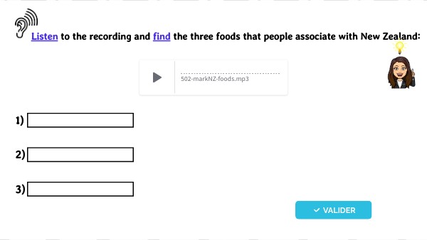 Listen to the recording and find the three foods that people associate with New Zealand: