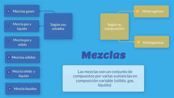 Las mezclas son un conjunto de compuestos por varias sustancias en composición variable (sólido, gas, líquido)