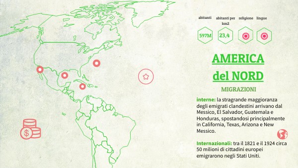 interne: la stragrande maggioranza degli emigrati clandestini arrivano dal Messico, El Salvador, Guatemala e Honduras, spostandosi principalmente in California, Texas, Arizona e New Messico. Internazionali: tra il 1821 e il 1924 circa 50 milioni di cittadini europei emigrarono negli Stati Uniti.