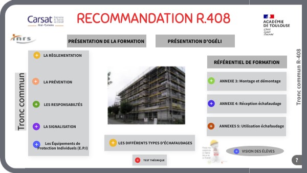 L’arrêté du 8 novembre 2012 (BO n°46 du 13 décembre 2012) Pour les diplômes professionnels (voir référentiel) relevant des dispositions du code du travail relatives à l’utilisation des équipements de travail mis à disposition pour des travaux temporaires en hauteur, les candidats à l'obtention de ces diplômes professionnels doivent, lors de leur confirmation d'inscription à l'examen, fournir l'attestation de formation prévue par la recommandation R. 408 de la Caisse nationale d'assurance maladie et des travailleurs salariés relative, en tout ou partie, au montage, à la réception, à l'utilisation et au démontage des échafaudages de pied (annexes 3,4 et 5).