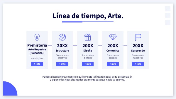 Puedes describir brevemente en qué consiste la línea temporal de tu presentación y exponer los hitos alcanzados oralmente para que nadie se duerma.