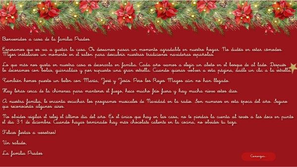 Bienvenidos a casa de la familia Prados. Esperamos que os va a gustar la casa. Os deseamos pasar un momento agradable en nuestro hogar. No dudéis en estar cómodos. Mejor instalaros un momento en el salón para descubrir nuestras tradiciones navideñas españolas. Lo que más nos gusta en nuestra casa es decorarla en familia. Cada año vamos a elegir un abeto en el bosque de al lado. Después lo decoramos con bolas, guirnaldas y por supuesto una gran estrella. Cuando quieras volver a esta página, dadle un clic a la estrella. También hemos puesto un belén con María, José y Jesús. Pero los Reyes Magos aún no han llegado. Hay leñas cerca de la chimenea para mantener el fuego, hace mucho frío fuera y hay mucha nieve estos días. A nuestra familia, le encanta escuchar los programes musicales de Navidad en la radio. Son numeros en esta época del año. Seguro que reconocerás algunos aires. No olvides vigilar el reloj el último día del año. Es el único que hay en las casa, no te pierdas la cuenta al revés a las doce en punto el día 31 de diciembre. Cuando hayas terminado hay más chocolate caliente en la cocina, no olvides tu taza. Felices fiestas a vosotros! Un saludo, La familia Prados