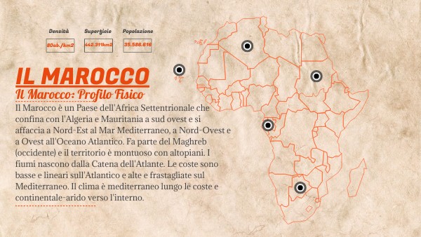 Il Marocco è un Paese dell'Africa Settentrionale che confina con l'Algeria e Mauritania a sud ovest e si affaccia a Nord-Est al Mar Mediterraneo, a Nord-Ovest e a Ovest all'Oceano Atlantico. Fa parte del Maghreb (occidente) e il territorio è montuoso con altopiani. I fiumi nascono dalla Catena dell'Atlante. Le coste sono basse e lineari sull'Atlantico e alte e frastagliate sul Mediterraneo. Il clima è mediterraneo lungo le coste e continentale-arido verso l'interno.
