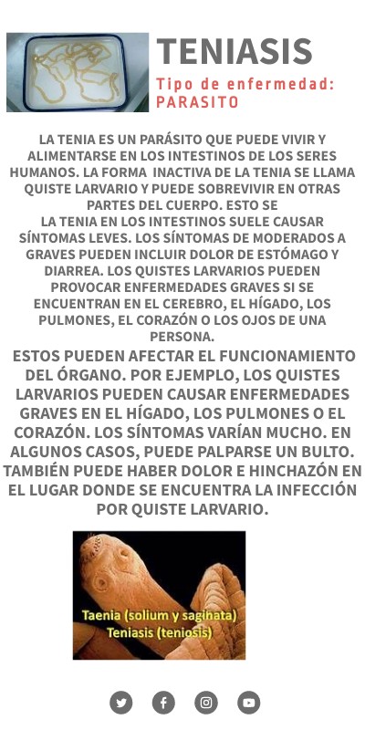 La tenia es un parásito que puede vivir y alimentarse en los intestinos de los seres humanos. La forma inactiva de la tenia se llama quiste larvario y puede sobrevivir en otras partes del cuerpo. Esto seLa tenia en los intestinos suele causar síntomas leves. Los síntomas de moderados a graves pueden incluir dolor de estómago y diarrea. Los quistes larvarios pueden provocar enfermedades graves si se encuentran en el cerebro, el hígado, los pulmones, el corazón o los ojos de una persona.