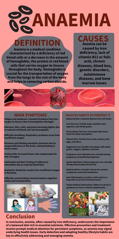 In conclusion, anemia, often caused by iron deficiency, underscores the importance of a balanced diet rich in essential nutrients. Effective prevention and treatment involve prompt medical attention for persistent symptoms, as anemia may signal underlying health issues. Early detection and adopting healthy lifestyle habits are key to effectively addressing and managing anemia.