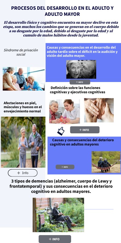 El desarrollo físico y cognitivo encuentra su mayor declive en esta etapa, son muchos los cambios que se generan en el cuerpo debido a su desgaste por la edad, debido al desgaste por la edad y al cumulo de malos hábitos desde la juventud.