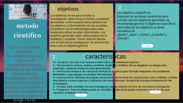 T1.- Es factico. Se ciñe a los hechos es decir tiene una referencia empírica. 2.- Tracciende los hechos, analiza y sintetiza. Analítico y sintético: Busca desglosar un allasgo para explicarlo y después integrarlo para generalizarlo. 3.- Verificación empírica. Se vale de la verificación empírica para formular respuesta a los problemas planteados y para apoyar sus propias afirmaciones. 4.- Autocorrectivo. Rechaza las propias concluciones. Al no tomar las concluciones como infalibles y finales esta abierto a nuevos aportes y utilización de nuevas técnicas. No permite la propia interpretación del investigador. 5.- Circular: Cada resultado de una investigación puede volverse el inicio de una nueva investigación. 6.- Progresivo: Todo resultado puede ser refutable y cada teoría puede sustentar nuevas teorías que resuelvan problemas pasados.