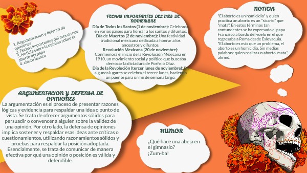 1. Argumentacion y defensa de opiniones2. Fechas importantes del mes de nov. 3. Noticia sobre la opinion sobre el aborto del papa . 4. chiste blanco