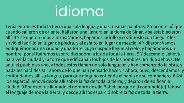 Tenía entonces toda la tierra una sola lengua y unas mismas palabras. 2 Y aconteció que cuando salieron de oriente, hallaron una llanura en la tierra de Sinar, y se establecieron allí. 3 Y se dijeron unos a otros: Vamos, hagamos ladrillo y cozámoslo con fuego. Y les sirvió el ladrillo en lugar de piedra, y el asfalto en lugar de mezcla. 4 Y dijeron: Vamos, edifiquémonos una ciudad y una torre, cuya cúspide llegue al cielo; y hagámonos un nombre, por si fuéremos esparcidos sobre la faz de toda la tierra. 5 Y descendió Jehová para ver la ciudad y la torre que edificaban los hijos de los hombres. 6 Y dijo Jehová: He aquí el pueblo es uno, y todos estos tienen un solo lenguaje; y han comenzado la obra, y nada les hará desistir ahora de lo que han pensado hacer. 7 Ahora, pues, descendamos, y confundamos allí su lengua, para que ninguno entienda el habla de su compañero. 8 Así los esparció Jehová desde allí sobre la faz de toda la tierra, y dejaron de edificar la ciudad. 9 Por esto fue llamado el nombre de ella Babel, porque allí confundió[a] Jehová el lenguaje de toda la tierra, y desde allí los esparció sobre la faz de toda la tierra.