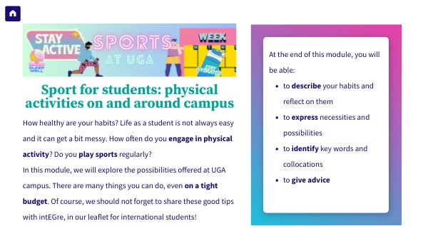 How healthy are your habits? Life as a student is not always easy and it can get a bit messy. How often do you engage in physical activity? Do you play sports regularly? In this module, we will explore the possibilities offered at UGA campus. There are many things you can do, even on a tight budget. Of course, we should not forget to share these good tips with intEGre, in our leaflet for international students!