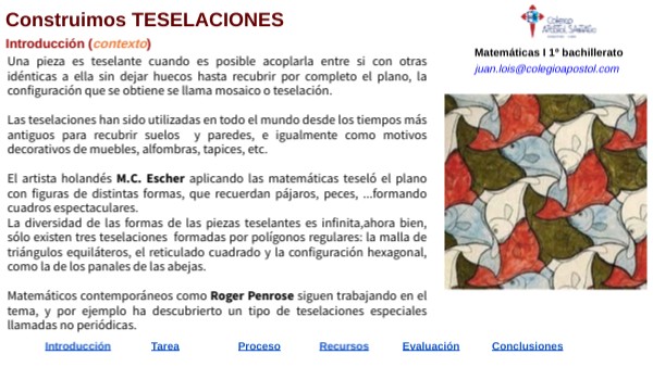 La tarea será hacer una investigación en internet sobre las teselaciones para: Elaborar un póster en tamaño A3 plastificado que contenga: 1) Un Mosaico a partir dunha tesela hexagonal pintado a mano y escaneado que incluya por lo menos 5 colores. 2) Un texto breve (< 50 palabras) explicando qué son las teselaciones. 3) Una breve reseña bibliográfica (<40 palabras) de M.C. Escher. 4) Una obra de Escher, indica título y fecha e incluye algún comentario de por qué la has elegido (< 20 palabras) 5) Incluya una foto original de una teselación de tu entorno. 6) Una pequeña reflexión personal (< 50 palabras) 7) Referencias 8) Indentificación:Autor, Escudo Colegio, fecha, Matematicas I.