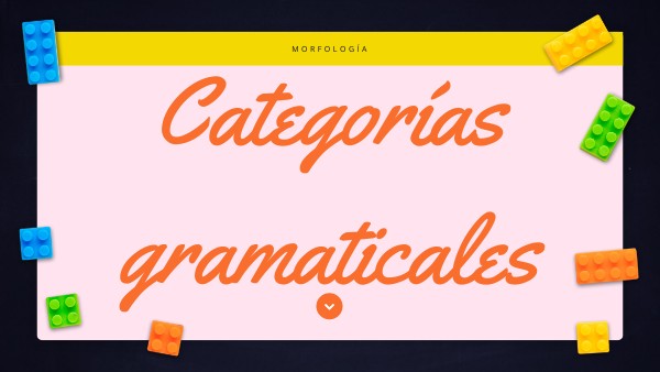 SUSTANTIVO: nombra cosas.Juan, casa, deberes...DETERMINANTE: concreta el sustantivo.Hay varios tipos: artículo, indefinido, numeral (cardinal, ordinal...), demostrativo, posesivo.un, los, mis, segundo, algunos...ADJETIVO: describe cosas.verde, bueno, grande, social...PRONOMBRE: sustituye al sustantivo, o al sintagma nominal completo.Hay varios tipos: indefinido, numeral (cardinal, ordinal...), demostrativo, posesivo, personal.unos, míos, yo, éste... VERBO: indica acciones o estados. Es la única categoría que tiene tiempos verbales (presente, pasado, futuro)Hya varios tipos, pero los veremos en otro lugar.cantaban, serán, ir...