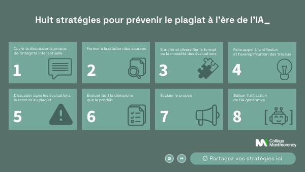 Lavigueur, P., You, D. (2024, 18 janvier). Huit stratégies pour prévenir le plagiat à l'ère de l'IA. https://view.genial.ly/6566300b235be20015550265/guide-huit-strategies-pour-prevenir-le-plagiat-a-lere-de-lia