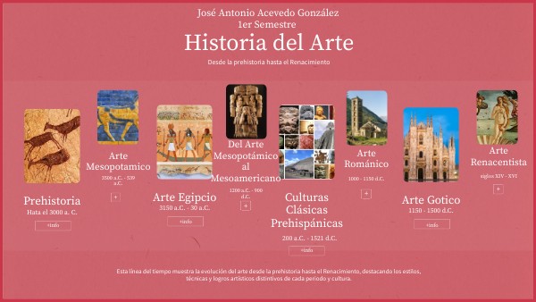 Esta línea del tiempo muestra la evolución del arte desde la prehistoria hasta el Renacimiento, destacando los estilos, técnicas y logros artísticos distintivos de cada periodo y cultura.