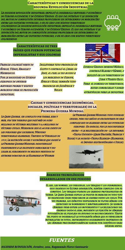 SEGUNDA REVOLUCIÓN, Octubre, 2016, Raymundo Flores Santuario https://portalacademico.cch.unam.mx/historiauniversal2/imperialismo-capitalista/creditos El Imperialismo, Abril 15, Unitips https://blog.unitips.mx/el-imperialismo#:~:text=Expansi%C3%B3n%20imperialista&text=Francia%20coloniz%C3%B3%20parte%20de%20%C3%81frica,B%C3%A9lgica%20coloniz%C3%B3%20El%20Congo. ¿Cuáles fueron las causas y consecuencias de la Primera Guerra Mundial?, ERIN BLAKEMORE, 15 ABR 2019, 11:46 CEST https://www.nationalgeographic.es/historia/2019/04/cuales-fueron-las-causas-y-consecuencias-de-la-primera-guerra-mundial#header_15745686_0 PRIMERA GUERRA MUNDIAL: CONSECUENCIAS,Imperial War Museum, Enciclopedia del Holocausto https://encyclopedia.ushmm.org/content/es/article/world-war-i-aftermath DESARROLLO TECNOLÓGICO BÉLICO DURANTE 1ª GUERRA MUNDIAL, Publicación revista Toma, Septiembre - Octubre 2014 https://www.filmoteca.unam.mx/articulo/desarrollo-tecnologico-belico-durante-1a-guerra-mundial/#:~:text=El%20gas%2C%20las%20bombas%2C%20los,hab%C3%ADan%20cumplido%20con%20su%20cometido.&text=Los%20tanques%20fueron%20los%20grandes%20protagonistas%20en%20tierra.