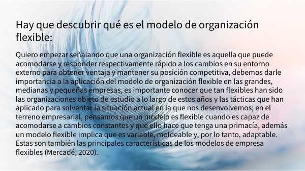 Quiero empezar señalando que una organización flexible es aquella que puede acomodarse y responder respectivamente rápido a los cambios en su entorno externo para obtener ventaja y mantener su posición competitiva, debemos darle importancia a la aplicación del modelo de organización flexible en las grandes, medianas y pequeñas empresas, es importante conocer que tan flexibles han sido las organizaciones objeto de estudio a lo largo de estos años y las tácticas que han aplicado para solventar la situación actual en la que nos desenvolvemos; en el terreno empresarial, pensamos que un modelo es flexible cuando es capaz de acomodarse a cambios constantes y que ello hace que tenga una primacía, además un modelo flexible implica que es variable, moldeable y, por lo tanto, adaptable. Estas son también las principales características de los modelos de empresa flexibles (Mercadé, 2020).
