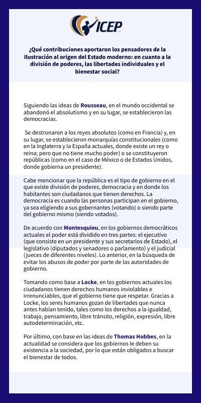 ¿Qué contribuciones aportaron los pensadores de la Ilustración al origen del Estado moderno: en cuanto a la división de poderes, las libertades individuales y el bienestar social?