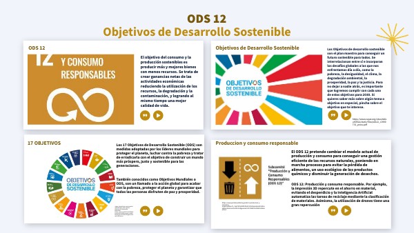 ODS 12: Producción y consumo responsable. Por ejemplo, la impresión 3D repercute en el ahorro en material, evitando el desperdicio y la Inteligencia Artificial automatiza las tareas de reciclaje mediante la clasificación de materiales. Asimismo, la utilización de drones tiene una gran repercusión