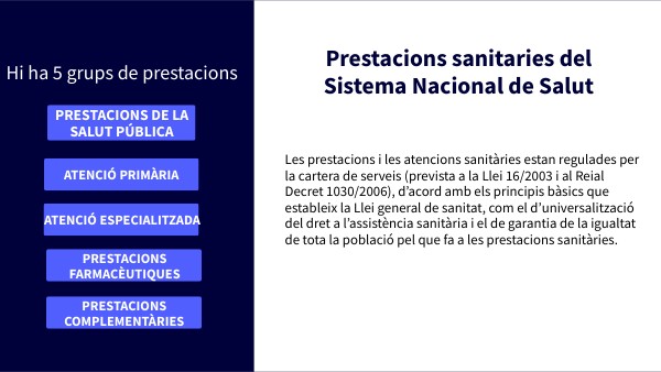 Les prestacions i les atencions sanitàries estan regulades per la cartera de serveis (prevista a la Llei 16/2003 i al Reial Decret 1030/2006), d’acord amb els principis bàsics que estableix la Llei general de sanitat, com el d’universalització del dret a l’assistència sanitària i el de garantia de la igualtat de tota la població pel que fa a les prestacions sanitàries.