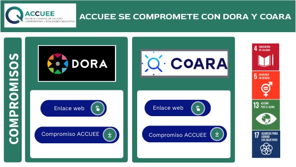 Formación: 5.- La ACCUEE se compromete a incluir dentro de su programa ‘ACCUEE Formación’, información específica vinculada a DORA. 6.- La ACCUEE se compromete a formar a su personal vinculado al área universitaria en todo lo referente al compromiso adquirido y a su vinculación con DORA.