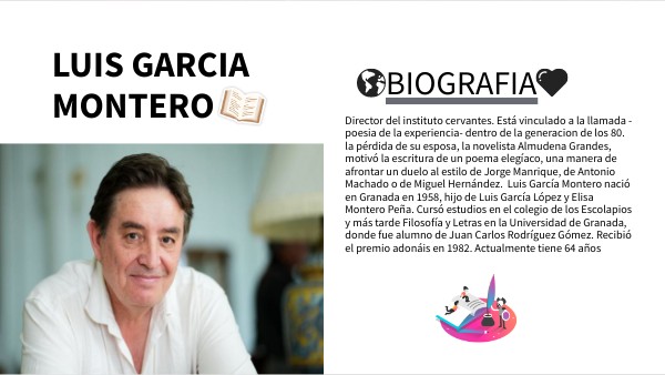 Director del instituto cervantes. Está vinculado a la llamada -poesia de la experiencia- dentro de la generacion de los 80. la pérdida de su esposa, la novelista Almudena Grandes, motivó la escritura de un poema elegíaco, una manera de afrontar un duelo al estilo de Jorge Manrique, de Antonio Machado o de Miguel Hernández. Luis García Montero nació en Granada en 1958, hijo de Luis García López y Elisa Montero Peña. Cursó estudios en el colegio de los Escolapios y más tarde Filosofía y Letras en la Universidad de Granada, donde fue alumno de Juan Carlos Rodríguez Gómez. Recibió el premio adonáis en 1982. Actualmente tiene 64 años