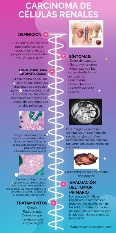 El carcinoma de células renales es una neoplasia maligna que surge del parénquima/corteza renal. El CCR de células claras representa la mayoría (80% a 90%) de las neoplasias renales primarias.