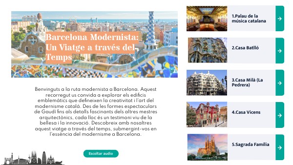 Benvinguts a la ruta modernista a Barcelona. Aquest recorregut us convida a explorar els edificis emblemàtics que defineixen la creativitat i l'art del modernisme català. Des de les formes espectaculars de Gaudí fins als detalls fascinants dels altres mestres arquitectònics, cada lloc és un testimoni viu de la bellesa i la innovació. Descobreix amb nosaltres aquest viatge a través del temps, submergint-vos en l'essència del modernisme a Barcelona.