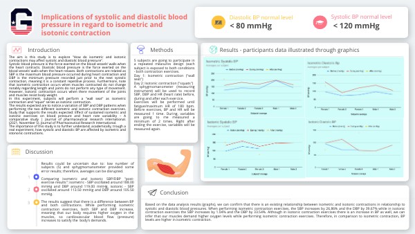 The aim is this study is to explore "How do isometric and isotonic contractions may affect systolic and diastolic blood pressure".Systolic blood pressure is the force exerted on the blood vessels’ walls when the heart contracts. Diastolic blood pressure is the force exerted on the blood vessels’ walls when the heart relaxes. Both contractions are related as SBP is the maximum blood pressure occurred during heart contraction and DBP is the minimum pressure recorded just prior to the next systolic contraction, meaning it is a constant repetitive process. Furthermore, note that isometric contraction occurs when muscles contracted do not change notably regarding length and joints do not perform any type of movement. However, isotonic contraction occurs when there movement of the joints and muscles resist body weight. In this experiment, subjects will perform a "wall seat" as isometric contraction and "squat" series as isotonic contraction.The results expected are to notice a variation of SBP and DBP patterns when performing the two different isometric and isotonic contraction exercises. Study that supports the results expected: Effect of sustained isometric and isotonic exercises on blood pressure and heart rate variability – A comparative study | Journal of pharmaceutical research international. (2021, November 5). Journal of Pharmaceutical Research International. The importance of this study is to further undestand, academically, trough a real experiment, how systolic and diastolic BP are affected by isometric and istononic contractions.