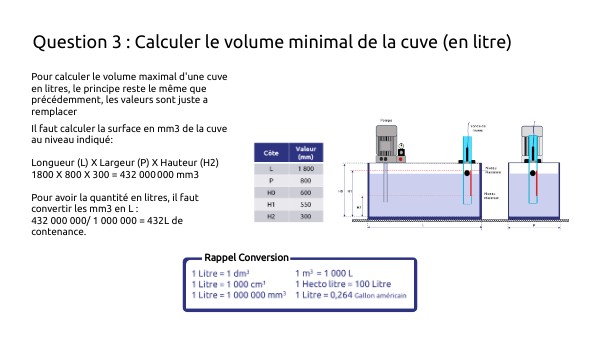 Question 3 : Calculer le volume minimal de la cuve (en litre)