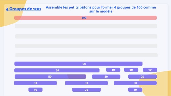 Assemble tous les petits bâtons pour former 4 groupes de 100 comme sur le modèle