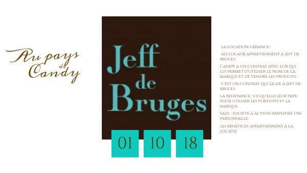 la location gérance : les locaux appartiennent à jeff de bruges. Candy a un contrat avec eux qui lui permet d’utiliser le nom de la marque et de vendre les produits. c'est un contrat qui l’a lie à jeff de bruges la redevance : ce qu'elle leur paye pour utiliser les porduits et la marque. sasu : société à action simplifiée uni personnelle. les bénéfices appartiennent à la société.