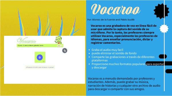 Vocaroo es a menudo demandado por profesores y estudiantes. Además, puede grabar su música, narración de historias y cualquier otro archivo de audio para descargar o compartir con sus amigos.